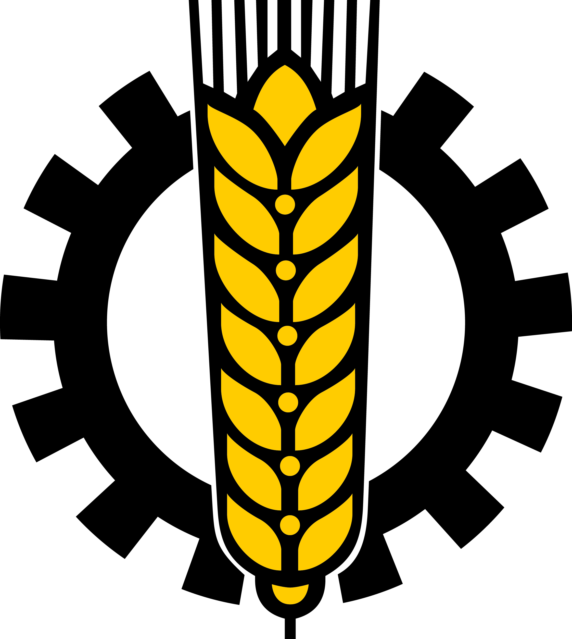 Eine gelbe Weizenähre überlagert ein schwarzes Zahnrad, das die Integration von Landwirtschaft und Industrie symbolisiert.