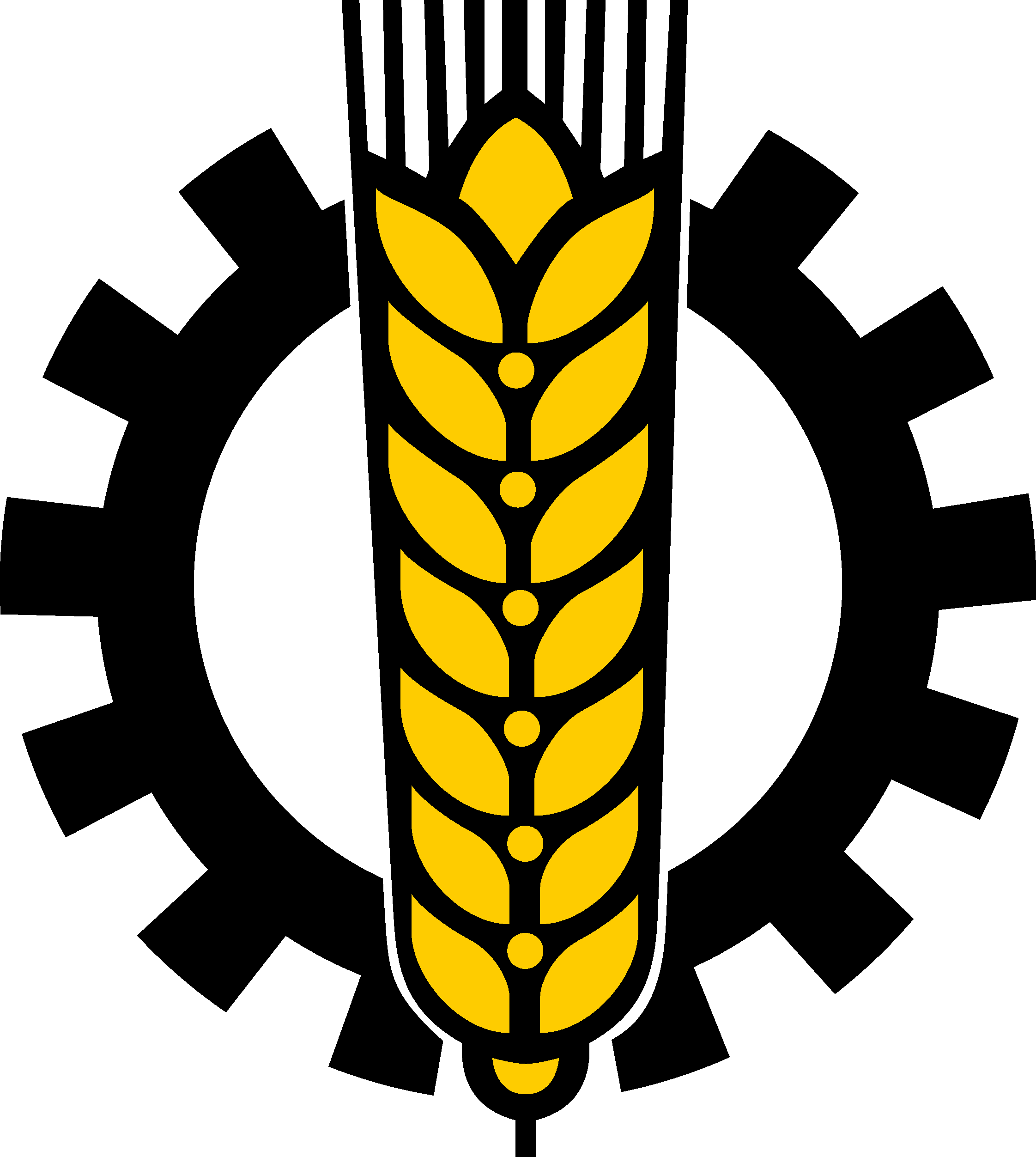 Eine gelbe Weizenähre auf einem schwarzen Zahnrad als Symbol für Landwirtschaft und Industrie.